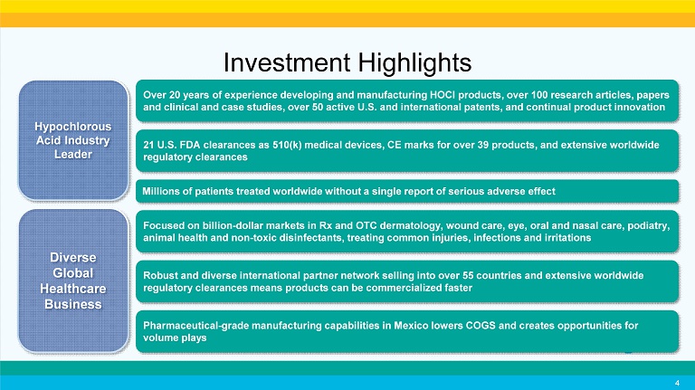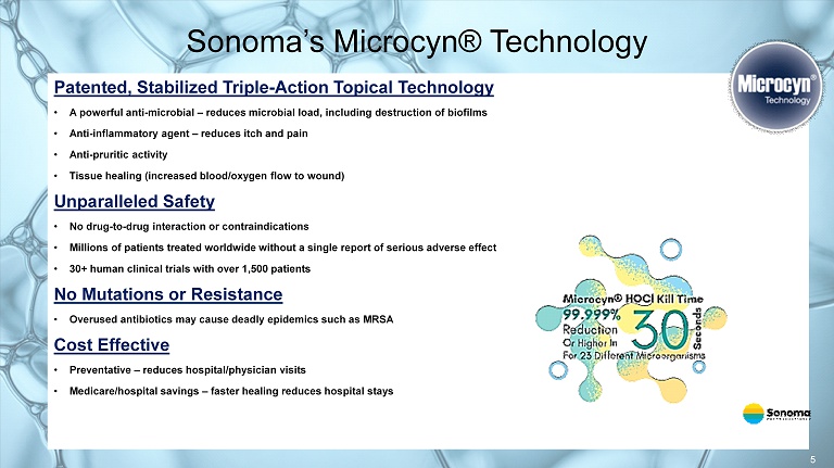Over 20 years of experience developing and manufacturing HOCl products, over 100 research articles, papers and clinical and case studies, over 50 active U.S. and international patents, and continual product innovation Hypochlorous Acid Industry Leader 21 U.S. FDA clearances as 510(k) medical devices, CE marks for over 39 products, and extensive worldwide regulatory clearances Millions of patients treated worldwide without a single report of serious adverse effect Focused on billion - dollar markets in Rx and OTC dermatology, wound care, eye, oral and nasal care, podiatry, animal health and non - toxic disinfectants, treating common injuries, infections and irritations Diverse Global Healthcare Business Investment Highlights Robust and diverse international partner network selling into over 55 countries and extensive worldwide regulatory clearances means products can be commercialized faster Pharmaceutical - grade manufacturing capabilities in Mexico lowers COGS and creates opportunities for volume plays 4