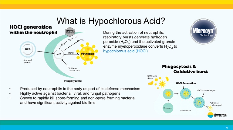 Sonoma’s Microcyn ® Technology Patented, Stabilized Triple - Action Topical Technology • A powerful anti - microbial – reduces microbial load, including destruction of biofilms • Anti - inflammatory agent – reduces itch and pain • Anti - pruritic activity • Tissue healing (increased blood/oxygen flow to wound) Unparalleled Safety • No drug - to - drug interaction or contraindications • Millions of patients treated worldwide without a single report of serious adverse effect • 30+ human clinical trials with over 1,500 patients No Mutations or Resistance • Overused antibiotics may cause deadly epidemics such as MRSA Cost Effective • Preventative – reduces hospital/physician visits • Medicare/hospital savings – faster healing reduces hospital stays 5