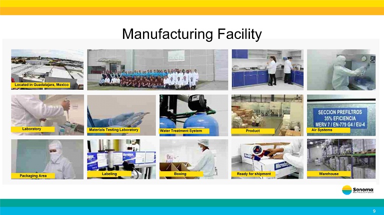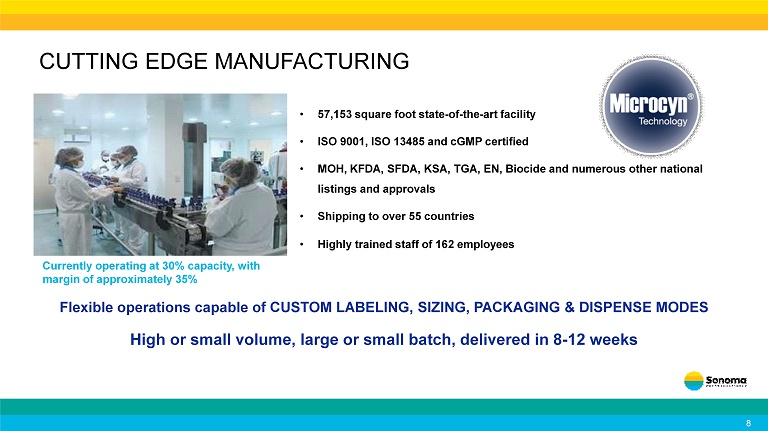 • 57,153 square foot state - of - the - art facility • ISO 9001, ISO 13485 and cGMP certified • MOH, KFDA, SFDA, KSA, TGA, EN, Biocide and numerous other national listings and approvals • Shipping to over 55 countries • Highly trained staff of 162 employees CUTTING EDGE MANUFACTURING Flexible operations capable of CUSTOM LABELING, SIZING, PACKAGING & DISPENSE MODES High or small volume, large or small batch, delivered in 8 - 12 weeks Currently operating at 30% capacity, with margin of approximately 35% 8