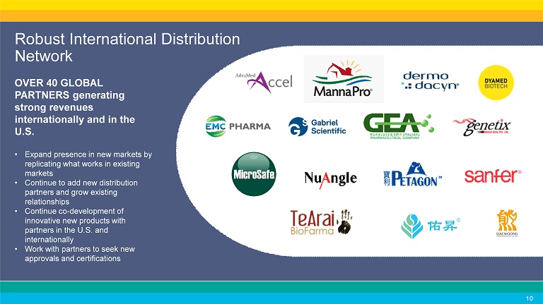 U.S. Animal Health Care MicrocynAH ® family of advanced animal healthcare products, safe to use on pets and livestock, and perfect for hot spots, pink eye, scratches, skin rashes and ulcers, cuts, burns, post - surgical sites, irritated skin and lacerations. • Sold in national pet - store retail chains and specialty stores such as Petsmart , Chewy.com , Tractor Supply , Cabela’s and Bass Pro Shops . MicrocynVS® veterinarian - strength animal care for use in vet clinics and animal hospitals. 23