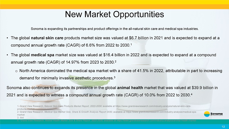 Sonoma is expanding its partnerships and product offerings in the all - natural skin care and medical spa industries. • The global natural skin care products market size was valued at $6.7 billion in 2021 and is expected to expand at a compound annual growth rate (CAGR) of 6.6% from 2022 to 2030. 1 • The global medical spa market size was valued at $16.4 billion in 2022 and is expected to expand at a compound annual growth rate (CAGR) of 14.97% from 2023 to 2030. 2 o North America dominated the medical spa market with a share of 41.5% in 2022, attributable in part to increasing demand for minimally invasive aesthetic procedures. 3 Sonoma also continues to expands its presence in the global animal health market that was valued at $39.9 billion in 2021 and is expected to witness a compound annual growth rate (CAGR) of 10.0% from 2022 to 2030. 4 New Market Opportunities 1. Grand View Research, Natural Skin Care Products Market Report, 2022 - 2030 , available at https://www.grandviewresearch.com/industry - analysis/natural - skin - care - products - market 2. Grand View Research, Medical Spa Market Size, Share & Growth Analysis Report 2030 , available at https://www.grandviewresearch.com/industry - analysis/medical - spa - market 3. Ibid. 4. Grand View Research, Animal Health Market Size & Share Report, 2022 - 2030 , available at https://www.grandviewresearch.com/industry - analysis/animal - health - market 12