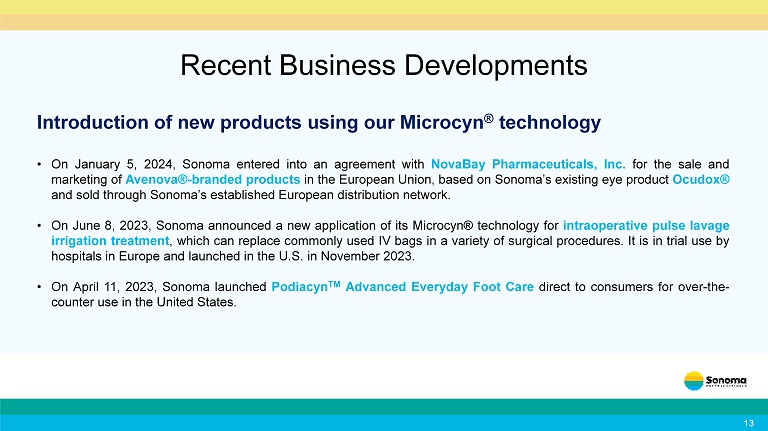 Introduction of new products using our Microcyn ® technology • On January 5 , 2024 , Sonoma entered into an agreement with NovaBay Pharmaceuticals, Inc . for the sale and marketing of Avenova ® - branded products in the European Union, based on Sonoma’s existing eye product Ocudox ® and sold through Sonoma’s established European distribution network . • On June 8 , 2023 , Sonoma announced a new application of its Microcyn ® technology for intraoperative pulse lavage irrigation treatment , which can replace commonly used IV bags in a variety of surgical procedures . It is in trial use by hospitals in Europe and launched in the U . S . in November 2023 . • On April 11 , 2023 , Sonoma launched Podiacyn TM Advanced Everyday Foot Care direct to consumers for over - the - counter use in the United States . Recent Business Developments 13