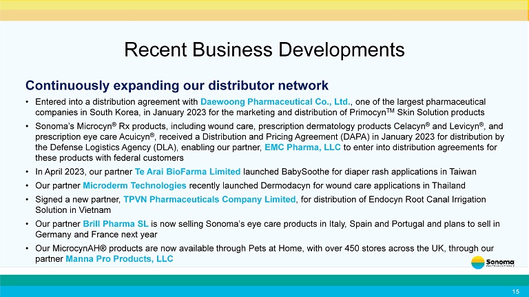 Expanding commercialization opportunities by investing in R&D • In March 2023 , Sonoma announced new EPA claims for its Nanocyn ® Hospital - Grade Disinfectant f or effective use against MRSA , Salmonella , Norovirus , Poliovirus , and as a fungicide . Nanocyn was previously approved for use against COVID - 19 as well as emerging pathogens including Ebola virus , Mpox , and SARS - CoV - 2 . Nanocyn also received the esteemed Green Seal ® Certification after surpassing a series of rigorous standards that measure environmental health, sustainability and product performance . • Reliefacyn ® Advanced Itch - Burn - Rash - Pain Relief Hydrogel was awarded the N ATIONAL E CZEMA A SSOCIATION S EAL OF A CCEPTANCE TM Recent Business Developments 14