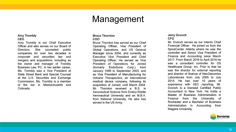 Management Amy Trombly CEO Amy Trombly is our Chief Executive Officer and also serves on our Board of Directors . She counseled public companies for over two decades in corporate and securities law and mergers and acquisitions, including as the owner and manager of Trombly Business Law, PC . In her earlier career, Ms . Trombly was a Vice President at State Street Bank and Special Counsel at the U . S . Securities and Exchange Commission . Ms . Trombly is a member of the bar in Massachusetts and Colorado . Bruce Thornton COO Bruce Thornton has served as our Chief Operating Officer, Vice President of Global Operations, and US General Manager since 2004 , and currently as Executive Vice President and Chief Operating Officer . He served as Vice President of Operations for Jomed (formerly EndoSonic Corp . ) from January 1999 to September 2003 , and as Vice President of Manufacturing for Volcano Therapeutics, an international medical device company, following its acquisition of Jomed , until March 2004 . Mr . Thornton received a B . S . in Aeronautical Science from Embry - Riddle Aeronautical University and an M . B . A . from National University . He also has served in the US Army . Jerry Dvonch CFO Mr . Dvonch serves as our Interim Chief Financial Officer . He joined us from the SpineCenter Atlanta where he was the controller and Senior Vice President of Finance and Accounting since March 2017 . From March 2016 to April 2016 he was a consultant controller for DS Healthcare Group, Inc . Prior to that he was the director for external reporting and director of finance of NeoGenomics Laboratories from July 2005 to July 2015 . He has over 10 years of experience with SEC reporting . Mr . Dvonch is a licensed Certified Public Accountant in New York . He holds a Master of Business Administration in Finance from the University of Rochester and a Bachelor of Business Administration in Accounting from Niagara University . 16