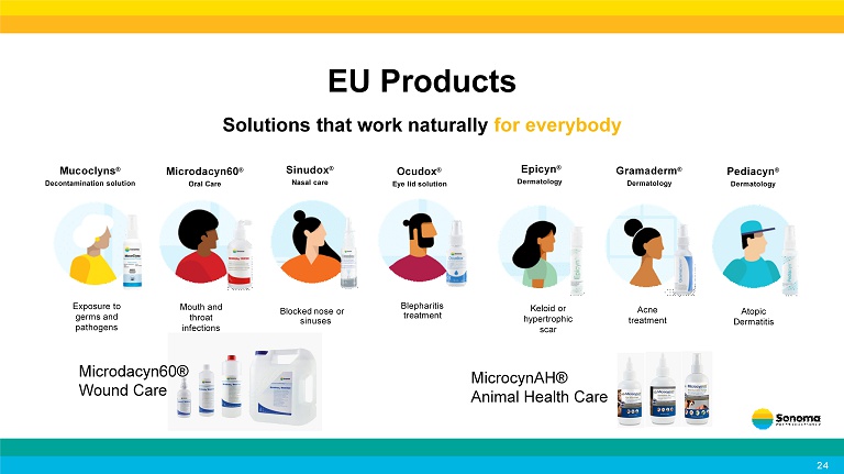 Epicyn ® Dermatology Gramaderm ® Dermatology Pediacyn ® Dermatology Mucoclyns ® Decontamination solution Microdacyn60 ® Oral Care Blocked nose or sinuses Sinudox ® Nasal care Blepharitis treatment Ocudox ® Eye lid solution Exposure to germs and pathogens Mouth and throat infections Keloid or hypertrophic scar Acne treatment Atopic Dermatitis Solutions that work naturally for everybody EU Products Microdacyn60® Wound Care MicrocynAH ® Animal Health Care 24