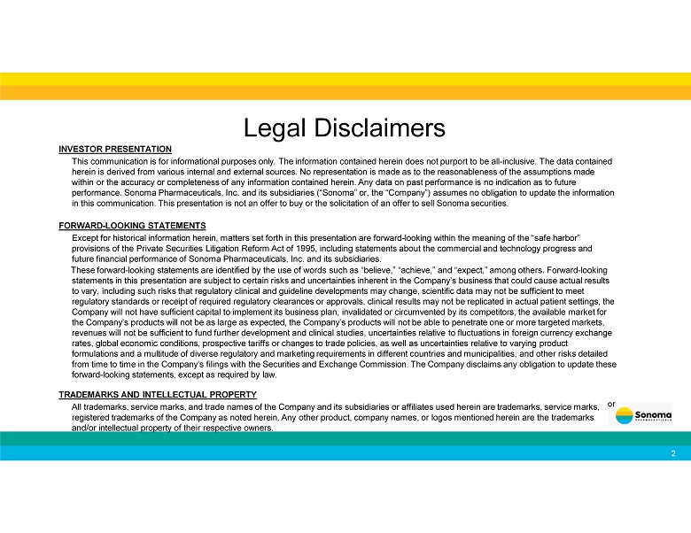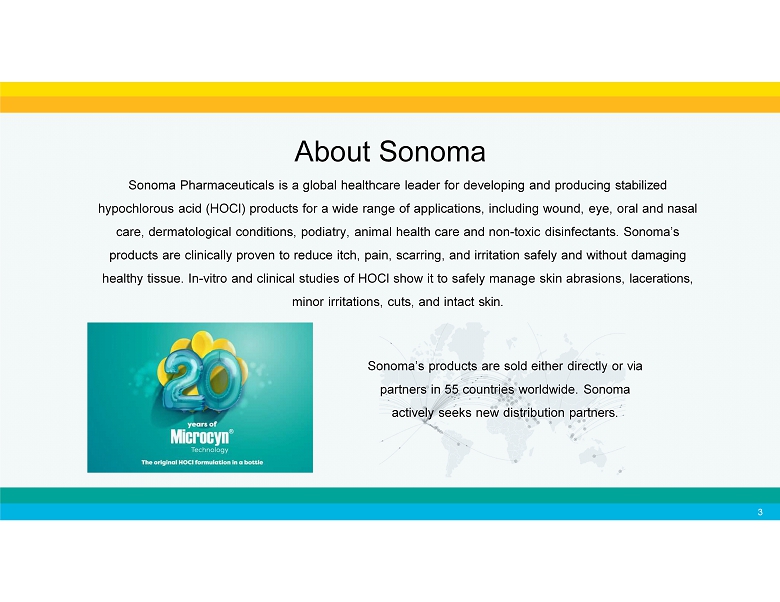 Legal Disclaimers or INVESTOR PRESENTATION This communication is for informational purposes only. The information contained herein does not purport to be all - inclusive. The data contained herein is derived from various internal and external sources. No representation is made as to the reasonableness of the assumptions made within or the accuracy or completeness of any information contained herein. Any data on past performance is no indication as to future performance. Sonoma Pharmaceuticals, Inc. and its subsidiaries (“Sonoma” or, the “Company”) assumes no obligation to update the information in this communication. This presentation is not an offer to buy or the solicitation of an offer to sell Sonoma securities. FORWARD - LOOKING STATEMENTS Except for historical information herein, matters set forth in this presentation are forward - looking within the meaning of the “safe harbor” provisions of the Private Securities Litigation Reform Act of 1995, including statements about the commercial and technology progress and future financial performance of Sonoma Pharmaceuticals, Inc. and its subsidiaries. These forward - looking statements are identified by the use of words such as “believe,” “achieve,” and “expect,” among others. Forward - looking statements in this presentation are subject to certain risks and uncertainties inherent in the Company’s business that could cause actual results to vary, including such risks that regulatory clinical and guideline developments may change, scientific data may not be sufficient to meet regulatory standards or receipt of required regulatory clearances or approvals, clinical results may not be replicated in actual patient settings, the Company will not have sufficient capital to implement its business plan, invalidated or circumvented by its competitors, the available market for the Company’s products will not be as large as expected, the Company’s products will not be able to penetrate one or more targeted markets, revenues will not be sufficient to fund further development and clinical studies, uncertainties relative to fluctuations in foreign currency exchange rates, global economic conditions, prospective tariffs or changes to trade policies, as well as uncertainties relative to varying product formulations and a multitude of diverse regulatory and marketing requirements in different countries and municipalities, and other risks detailed from time to time in the Company’s filings with the Securities and Exchange Commission. The Company disclaims any obligation to update these forward - looking statements, except as required by law. TRADEMARKS AND INTELLECTUAL PROPERTY All trademarks, service marks, and trade names of the Company and its subsidiaries or affiliates used herein are trademarks, service marks, registered trademarks of the Company as noted herein. Any other product, company names, or logos mentioned herein are the trademarks and/or intellectual property of their respective owners. 2