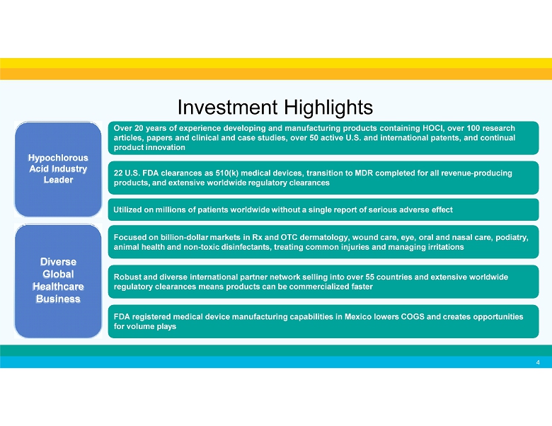 About Sonoma Sonoma Pharmaceuticals is a global healthcare leader for developing and producing stabilized hypochlorous acid (HOCl) products for a wide range of applications, including wound, eye, oral and nasal care, dermatological conditions, podiatry, animal health care and non - toxic disinfectants. Sonoma’s products are clinically proven to reduce itch, pain, scarring, and irritation safely and without damaging healthy tissue. In - vitro and clinical studies of HOCl show it to safely manage skin abrasions, lacerations, minor irritations, cuts, and intact skin. Sonoma’s products are sold either directly or via partners in 55 countries worldwide. Sonoma actively seeks new distribution partners. 3