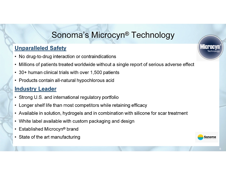 Sonoma’s Microcyn ® Technology Patented, Stabilized Triple - Action Topical Technology • HOCl kills microbes including bacteria, fungi and viruses while assisting healing • Relieves pain and itch • Improves wound care by cleaning and moistening the wound and peri - wound area • Safely manage skin abrasions, lacerations, minor irritations, cuts, burns, and intact skin • Applications in dermatology include atopic dermatitis, scar treatment and daily care May replace other treatments with side effects or health concerns • Overused antibiotics may cause deadly epidemics such as MRSA • May replace steroids for some patients • Avoids harmful ingredients such as benzoyl peroxide Cost Effective • Reduces hospital/physician visits • Medicare/hospital savings from reduced hospital stays 5