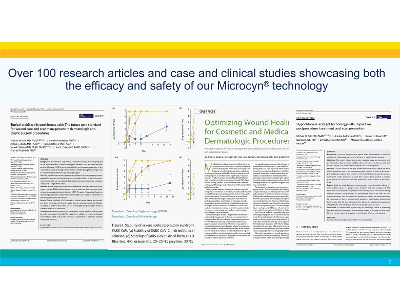 Over 100 research articles and case and clinical studies showcasing both the efficacy and safety of our Microcyn ® technology • Dermodacyn® Disinfecting solution study on viability of SARS - CoV - 2, see https:// www.sciencedirect.com/science/article/pii/S019567012030339X • Endocyn® study on cellular toxicity, see https:// www.sciencedirect.com/science/article/abs/pii/S0099239917310439 • HOCl study evaluating virucidal activity in Vero E6 cells against SARS - CoV - 2, University of Barcelona, 11/27/2020 • Hypochlorous acid gel technology — Its impact on post - procedure treatment and scar prevention, see https://sonomapharma.com/wp - content/uploads/2020/08/Gold_et_al - 2017 - Journal_of_Cosmetic_Dermatology - 003.pdf • Topical stabilized hypochlorous acid: The future gold standard for wound care and scar management in dermatologic and plastic surgery procedures, see https://sonomapharma.com/wp - content/uploads/2020/08/Topical - Stabilized - HOCL - consensus - article - 2020.pdf • HOCl Article: Optimizing Wound Healing for Procedures – Apr 2018, see https://sonomapharma.com/wp - content/uploads/2018/11/Pracitcal - Derm - HOCl - article - 4 - 7 - 18 - wounds.pdf 7