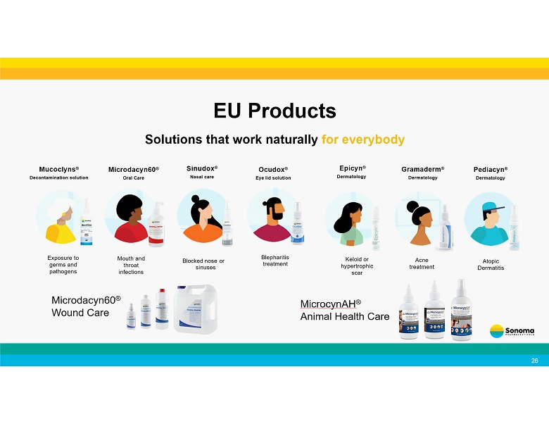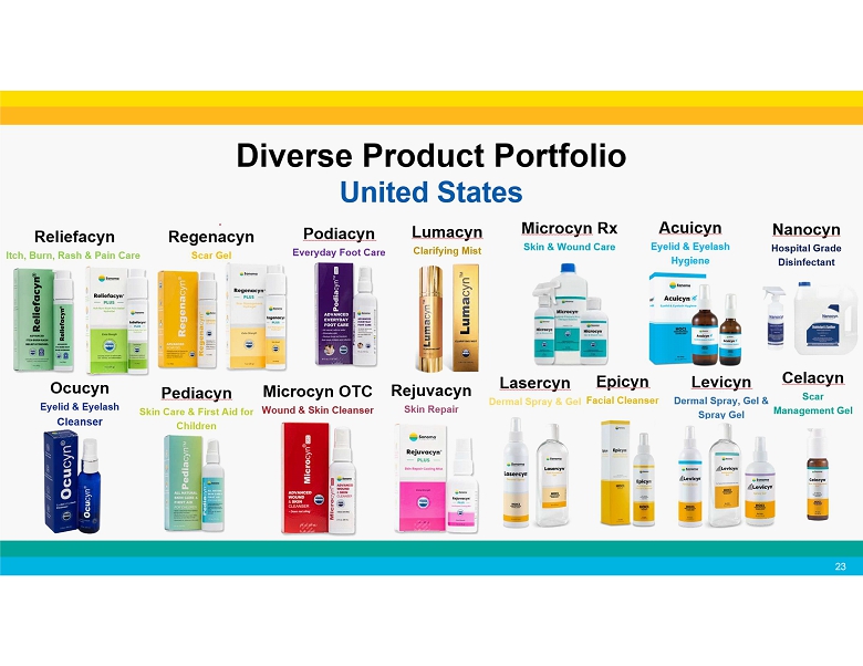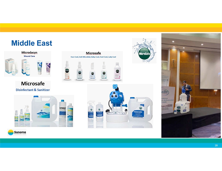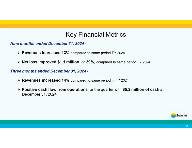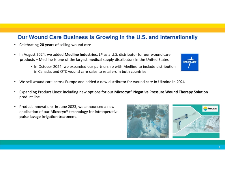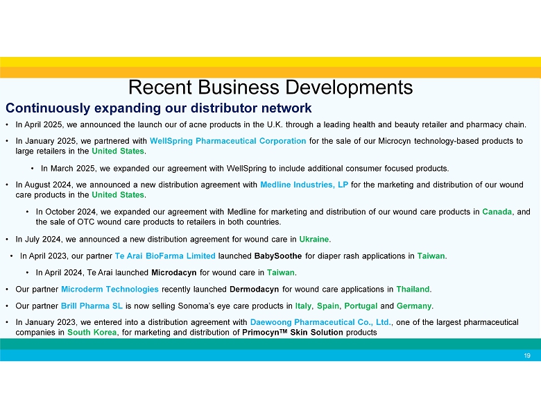 Continuously expanding our distributor network 19 • In April 2025, we announced the launch our of acne products in the U.K. through a leading health and beauty retailer and pharmacy chain. • In January 2025, we partnered with WellSpring Pharmaceutical Corporation for the sale of our Microcyn technology - based products to large retailers in the United States . • In March 2025, we expanded our agreement with WellSpring to include additional consumer focused products. • In August 2024, we announced a new distribution agreement with Medline Industries, LP for the marketing and distribution of our wound care products in the United States . • In October 2024, we expanded our agreement with Medline for marketing and distribution of our wound care products in Canada , and the sale of OTC wound care products to retailers in both countries. • In July 2024, we announced a new distribution agreement for wound care in Ukraine . • In April 2023, our partner Te Arai BioFarma Limited launched BabySoothe for diaper rash applications in Taiwan . • In April 2024, Te Arai launched Microdacyn for wound care in Taiwan . • Our partner Microderm Technologies recently launched Dermodacyn for wound care applications in Thailand . • Our partner Brill Pharma SL is now selling Sonoma’s eye care products in Italy , Spain , Portugal and Germany . • In January 2023, we entered into a distribution agreement with Daewoong Pharmaceutical Co., Ltd. , one of the largest pharmaceutical companies in South Korea , for marketing and distribution of Primocyn TM Skin Solution products Recent Business Developments