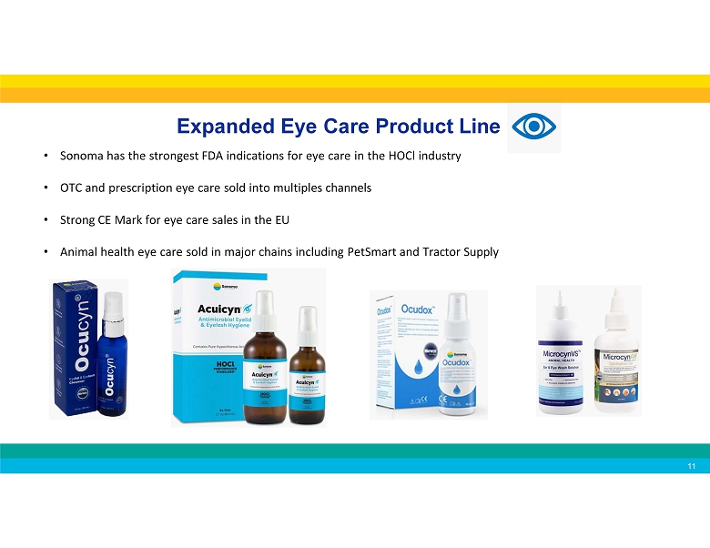 Industry - Leading Safe and Effective Dermatology Products • Products to relieve symptoms of atopic dermatitis, reduce scarring, and for daily skin care • Line of office dispense products targeting growing med spa market • Eczema seal of approval • All natural ingredients • No harmful chemicals • OTC, office dispense, and Rx products available • Innovating packaging available including high end and cost competitive options • Continual Product Innovation : Introduced Lumacyn TM Clarifying Mist in 2024, a daily toner formulated to reduce redness and manage blemishes by reducing infections. 10