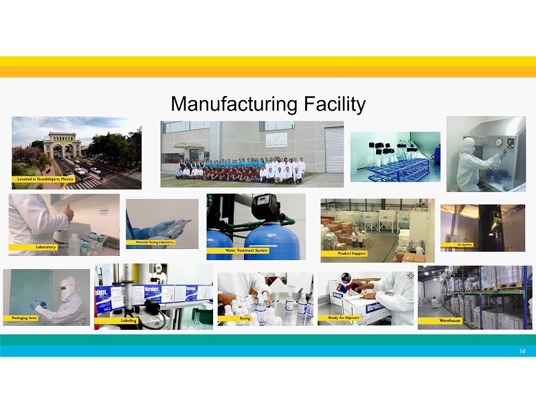• 57,153 square foot state - of - the - art facility • ISO 9001, ISO 13485 and cGMP certified • MOH, KFDA, SFDA, KSA, TGA, EN, Biocide and numerous other national listings and approvals • Shipping to over 55 countries, with multiple methods for shipments • Highly trained staff of 162 employees • Additional 11,840 square feet of overflow capacity CUTTING EDGE MANUFACTURING Flexible operations capable of CUSTOM LABELING, SIZING, PACKAGING & DISPENSE MODES High or small volume, large or small batch, delivered in 12 weeks Currently operating at 40% capacity with margin of approximately 35% 13