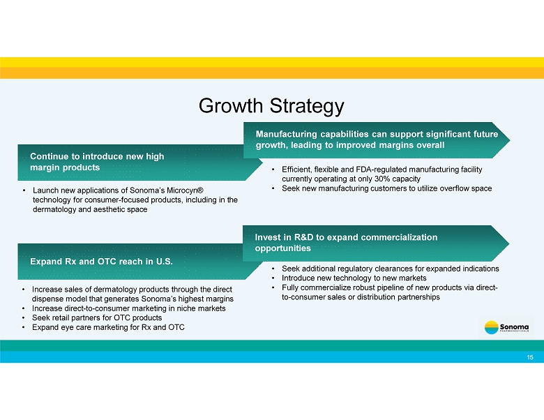 Continue to introduce new high margin products Manufacturing capabilities can support significant future growth, leading to improved margins overall • Launch new applications of Sonoma’s Microcyn® technology for consumer - focused products, including in the dermatology and aesthetic space Growth Strategy • Efficient, flexible and FDA - regulated manufacturing facility currently operating at only 30% capacity • Seek new manufacturing customers to utilize overflow space Expand Rx and OTC reach in U.S. • Increase sales of dermatology products through the direct dispense model that generates Sonoma’s highest margins • Increase direct - to - consumer marketing in niche markets • Seek retail partners for OTC products • Expand eye care marketing for Rx and OTC 15 Invest in R&D to expand commercialization opportunities • Seek additional regulatory clearances for expanded indications • Introduce new technology to new markets • Fully commercialize robust pipeline of new products via direct - to - consumer sales or distribution partnerships