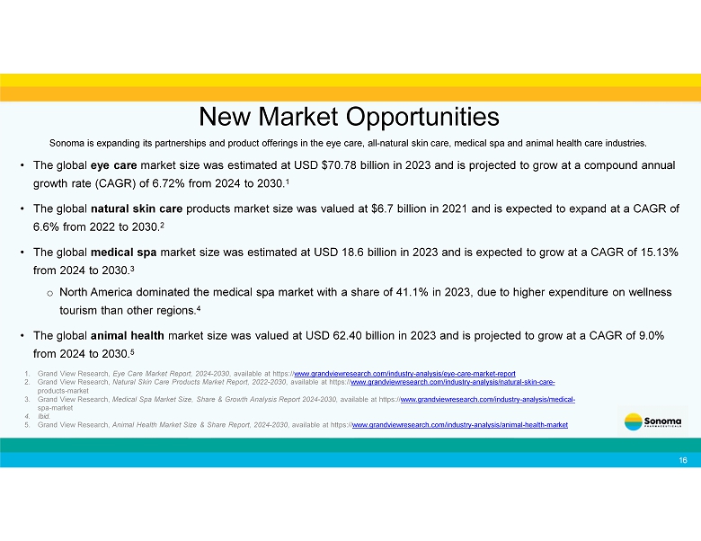 New Market Opportunities Sonoma is expanding its partnerships and product offerings in the eye care, all - natural skin care, medical spa and animal health care industries. • The global eye care market size was estimated at USD $70.78 billion in 2023 and is projected to grow at a compound annual growth rate (CAGR) of 6.72% from 2024 to 2030. 1 • The global natural skin care products market size was valued at $6.7 billion in 2021 and is expected to expand at a CAGR of 6.6% from 2022 to 2030. 2 • The global medical spa market size was estimated at USD 18.6 billion in 2023 and is expected to grow at a CAGR of 15.13% from 2024 to 2030. 3 o North America dominated the medical spa market with a share of 41.1% in 2023, due to higher expenditure on wellness tourism than other regions. 4 • The global animal health market size was valued at USD 62.40 billion in 2023 and is projected to grow at a CAGR of 9.0% from 2024 to 2030. 5 1. Grand View Research, Eye Care Market Report, 2024 - 2030 , available at https:// www.grandviewresearch.com/industry - analysis/eye - care - market - report 2. Grand View Research, Natural Skin Care Products Market Report, 2022 - 2030 , available at https:// www.grandviewresearch.com/industry - analysis/natural - skin - care - products - market 3. Grand View Research, Medical Spa Market Size, Share & Growth Analysis Report 2024 - 2030 , available at https:// www.grandviewresearch.com/industry - analysis/medical - spa - market 4. Ibid. 5. Grand View Research, Animal Health Market Size & Share Report, 2024 - 2030 , available at https:// www.grandviewresearch.com/industry - analysis/animal - health - market 16