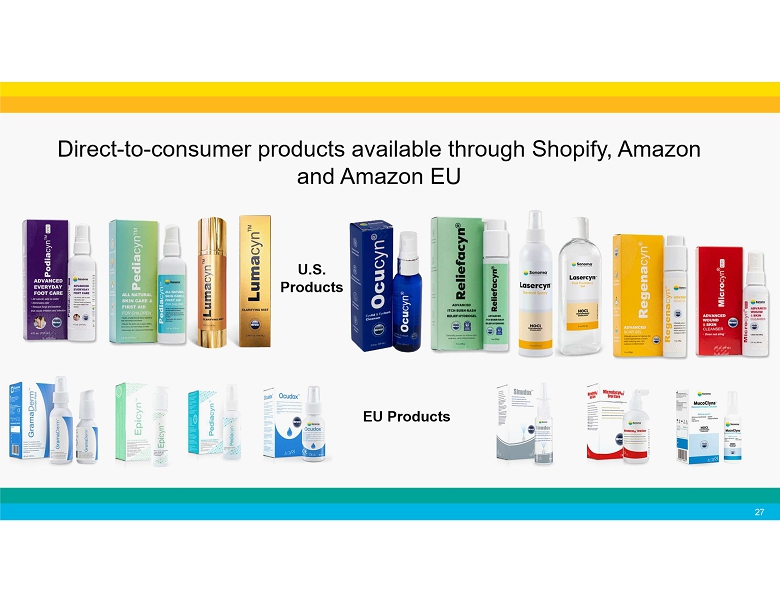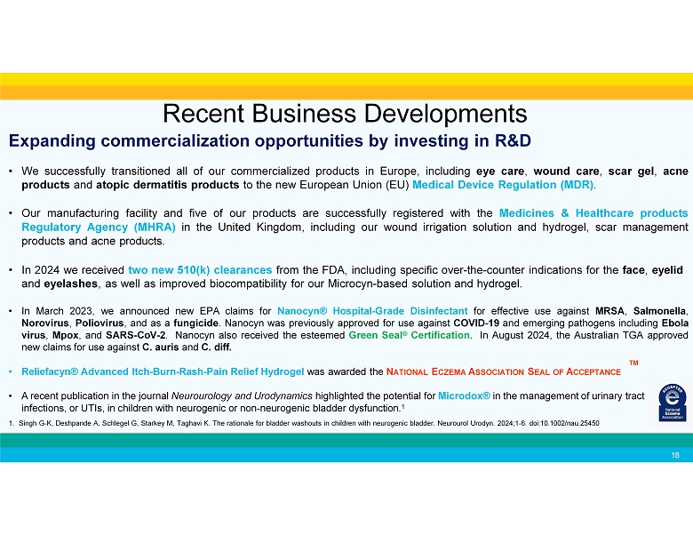 Expanding commercialization opportunities by investing in R&D • We successfully transitioned all of our commercialized products in Europe, including eye care , wound care , scar gel , acne products and atopic dermatitis products to the new European Union (EU) Medical Device Regulation (MDR) . • Our manufacturing facility and five of our products are successfully registered with the Medicines & Healthcare products Regulatory Agency (MHRA) in the United Kingdom, including our wound irrigation solution and hydrogel, scar management products and acne products . • In 2024 we received two new 510(k) clearances from the FDA, including specific over - the - counter indications for the face , eyelid and eyelashes , as well as improved biocompatibility for our Microcyn - based solution and hydrogel. • In March 2023 , we announced new EPA claims for Nanocyn® Hospital - Grade Disinfectant for effective use against MRSA , Salmonella , Norovirus , Poliovirus , and as a fungicide . Nanocyn was previously approved for use against COVID - 19 and emerging pathogens including Ebola virus , Mpox , and SARS - CoV - 2 . Nanocyn also received the esteemed Green Seal ® Certification . In August 2024 , the Australian TGA approved new claims for use against C . auris and C . diff . TM • Reliefacyn® Advanced Itch - Burn - Rash - Pain Relief Hydrogel was awarded the N ATIONAL E CZEMA A SSOCIATION S EAL OF A CCEPTANCE • A recent publication in the journal Neurourology and Urodynamics highlighted the potential for Microdox® in the management of urinary tract infections, or UTIs, in children with neurogenic or non - neurogenic bladder dysfunction. 1 1. Singh G - K, Deshpande A, Schlegel G, Starkey M, Taghavi K. The rationale for bladder washouts in children with neurogenic bladder. Neurourol Urodyn. 2024;1 - 6. doi:10.1002/nau.25450 Recent Business Developments 18