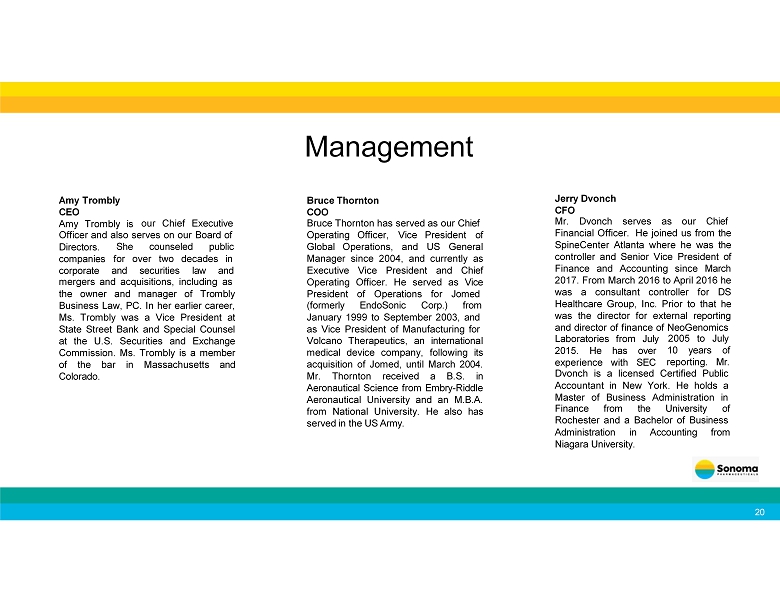 Management Amy Trombly CEO Amy Trombly is 20 our Chief Executive Officer and also serves on our Board of She counseled public Directors. companies corporate for over two decades in and securities law and mergers and acquisitions, including as the owner and manager of Trombly Business Law, PC . In her earlier career, Ms . Trombly was a Vice President at State Street Bank and Special Counsel at the U . S . Securities and Exchange Commission . Ms . Trombly is a member of the bar in Massachusetts and Colorado . Bruce Thornton COO Bruce Thornton has served as our Chief Operating Officer, Vice President of Global Operations, and US General Manager since 2004 , and currently as Executive Vice President and Chief Operating Officer . He served as Vice President of Operations for Jomed (formerly EndoSonic Corp.) from January 1999 to September 2003, and as Vice President of Manufacturing for Volcano Therapeutics, an international medical device company, following its acquisition of Jomed, until March 2004 . Mr . Thornton received a B . S . in Aeronautical Science from Embry - Riddle Aeronautical University and an M . B . A . from National University . He also has served in the US Army . Jerry Dvonch CFO Mr . Dvonch serves as our Chief Financial Officer . He joined us from the SpineCenter Atlanta where he was the controller and Senior Vice President of Finance and Accounting since March 2017 . From March 2016 to April 2016 he was a consultant controller for DS Healthcare Group, Inc . Prior to that he was the director for external reporting and director of finance of NeoGenomics Laboratories from July 2015. He has over experience with SEC 2005 to July 10 years of reporting. Mr. Dvonch is a licensed Certified Public Accountant in New York. He holds a Master of Business Administration in Finance from the University of Rochester and a Bachelor of Business Administration in Accounting from Niagara University.