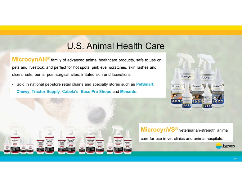 U.S. Animal Health Care MicrocynAH ® family of advanced animal healthcare products, safe to use on pets and livestock, and perfect for hot spots, pink eye, scratches, skin rashes and ulcers, cuts, burns, post - surgical sites, irritated skin and lacerations. • Sold in national pet - store retail chains and specialty stores such as PetSmart , Chewy , Tractor Supply , Cabela’s , Bass Pro Shops and Menards . MicrocynVS ® veterinarian - strength animal care for use in vet clinics and animal hospitals. 25